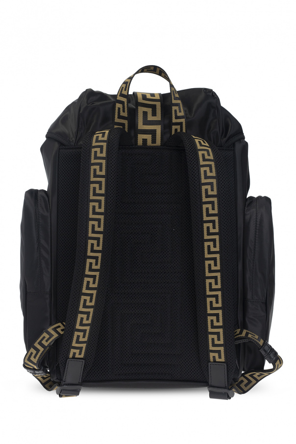 Black ‘Greca’ backpack from Versace. Crafted from glistening material, this design cinches closed with drawstrings and showcases stripes with the brand\'s signature pattern. It is complete with a gold-tone snap, three zipped pockets, perforated back, a half-round handle, adjustable shoulder straps and one internal compartment with a slip pocket and laptop sleeve.