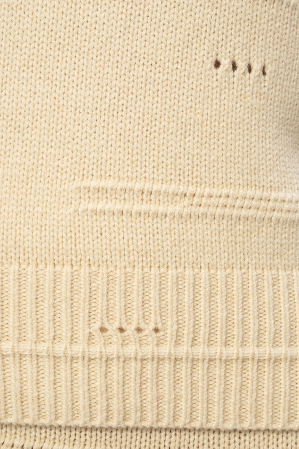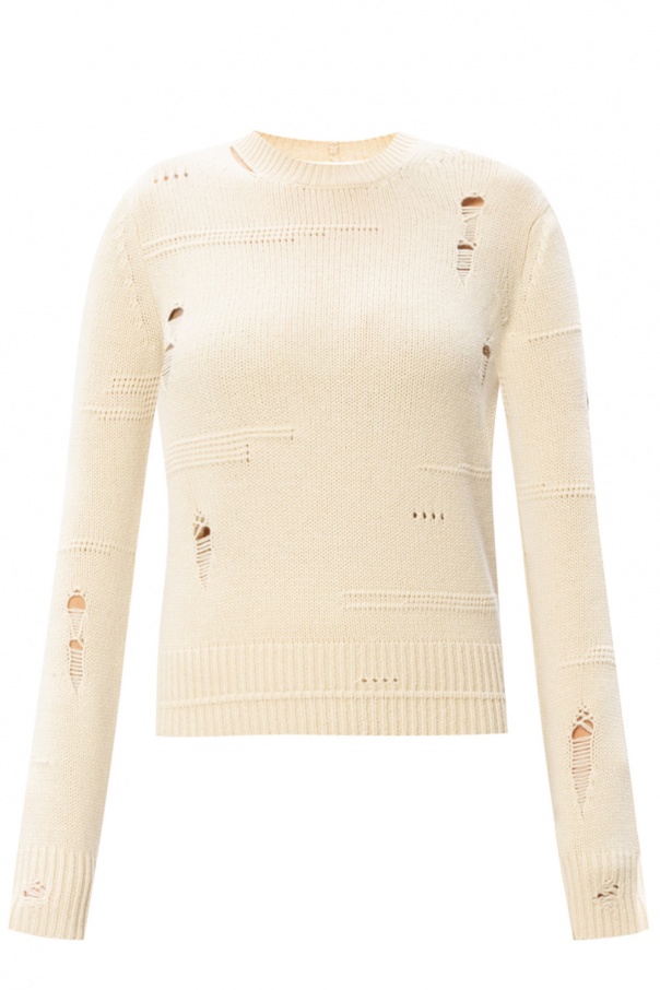 Cream sweater from Helmut Lang. Knitted from wool, this round neck design is enriched with a raw edge and ribbed trims at the hem and cuffs.