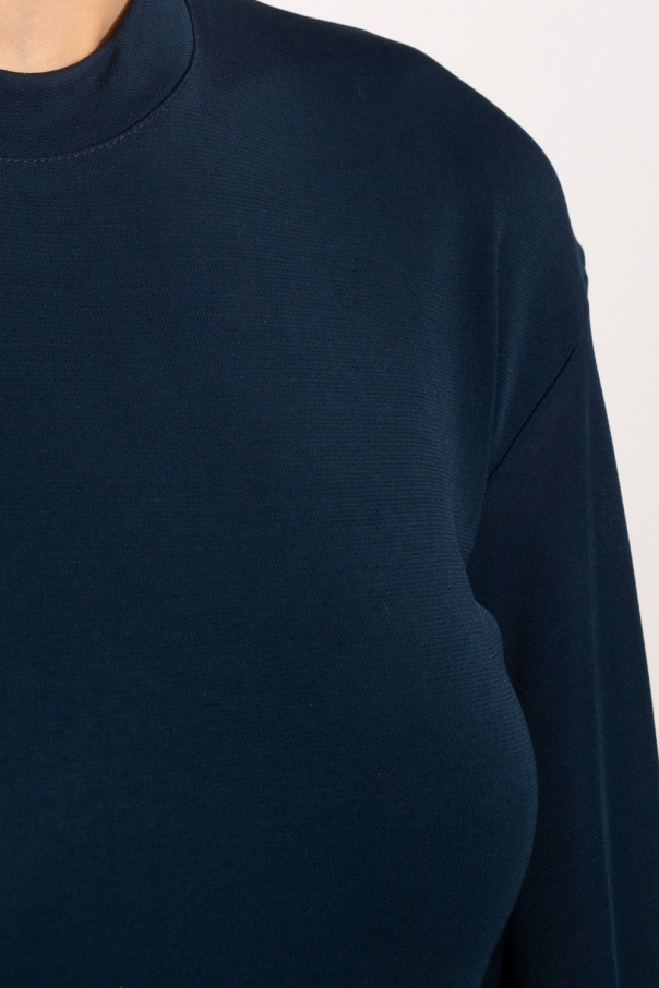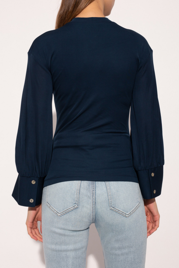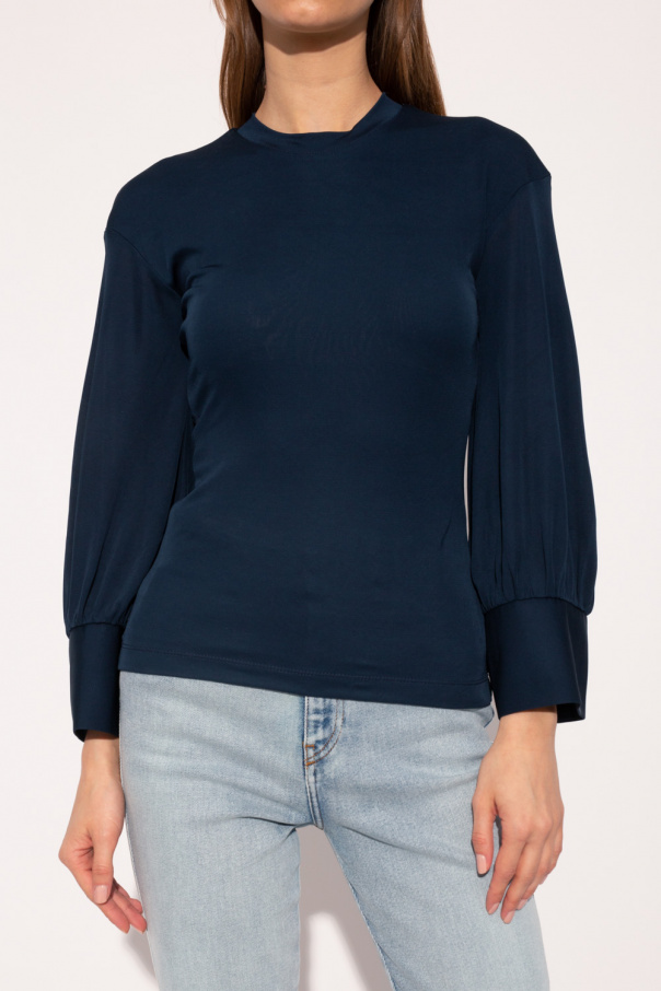 Navy ‘Berlain’ top from Aeron. This garment features a ribbed crew neck and long puff sleeves with button cuffs.