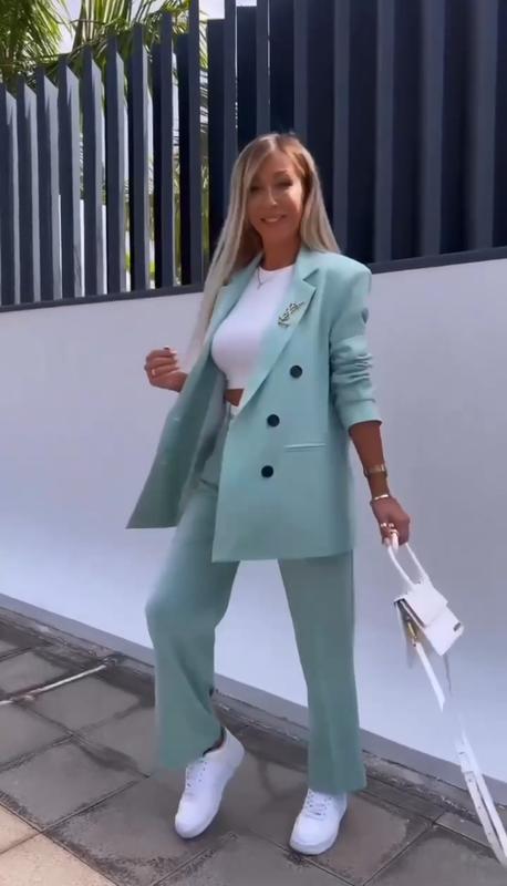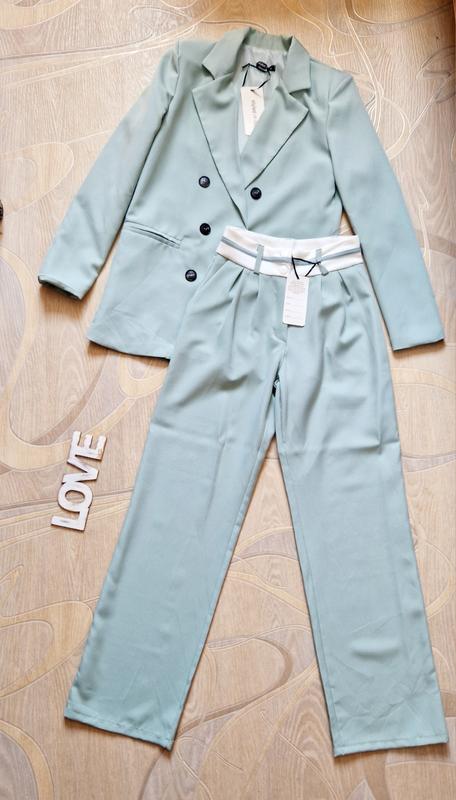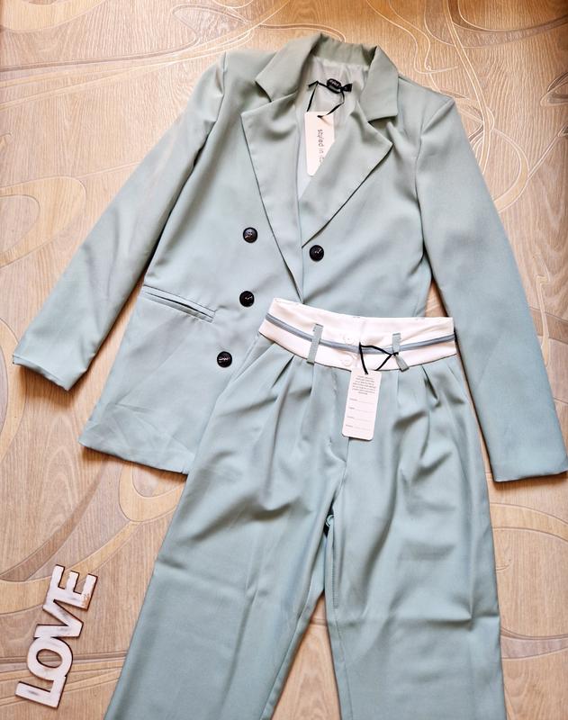 Стильный летний женский брючный костюм бирюзового цвета. Пиджак и брюки. Размер S. Замеры брюки: - пояс - 30 - бедра - 40 - длина - 107 Замеры пиджак: - длина рукава - 62 - ширина - 50 - длина - 74 Новый