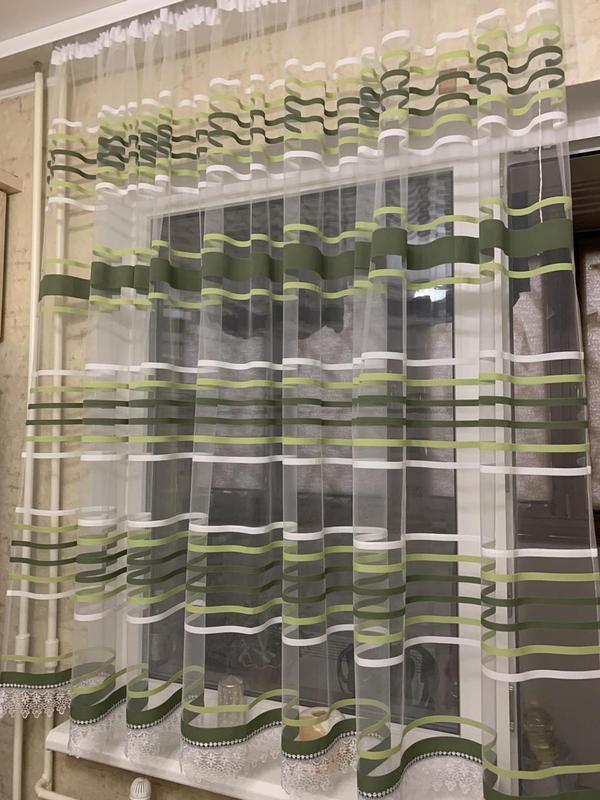 Готовый короткий тюль в полоску до подоконника, зеленый с салатовым. Низ арочный или ровный — на ваш выбор. Кружево можно изменить) Материал - Фатин Высота 150 см (можно изменить — уточняйте цену перед созданием заказа) Низ может быть арочный или ровный Ширина 300 см Вверху пришита тесьма