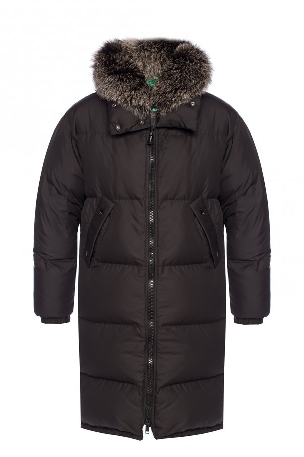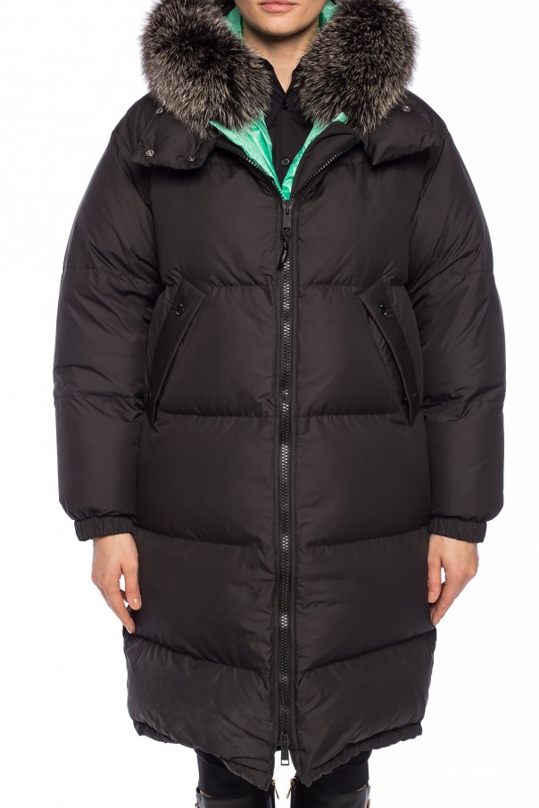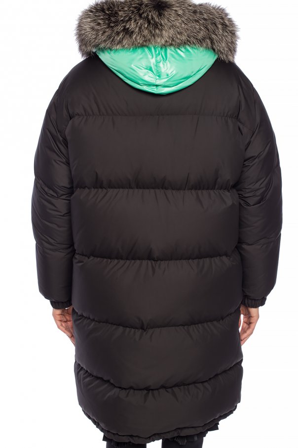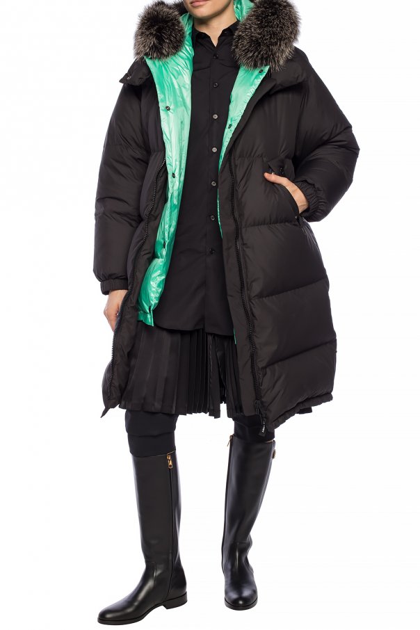 Two-layered quilted down jacket from Yves Salomon. Black outer layer fastened with a two-way zip. Two snap pockets on the front. Green inner layer featuring snap fastening and two slip pockets. Hood trimmed with detachable fur.