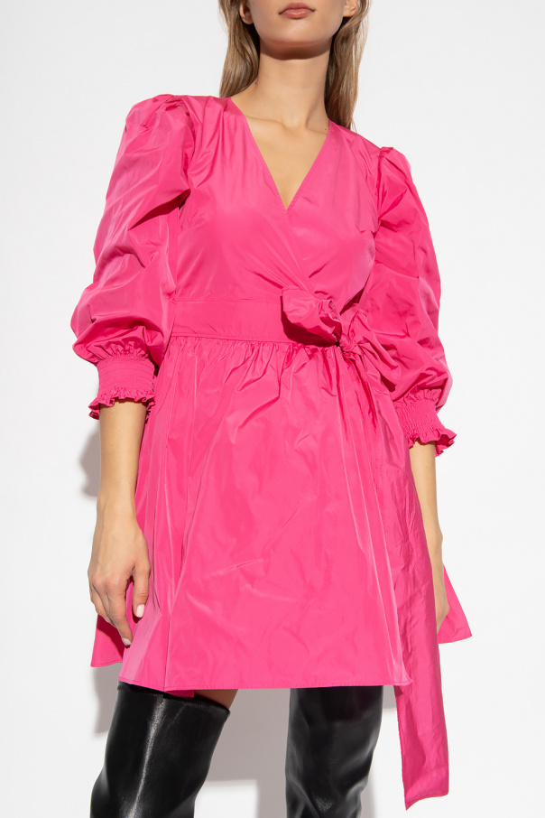 Pink wrap dress from Red Valentino. With waist-cinching belt, this style features two slip pockets and puff long sleeves with elasticated cuffs.