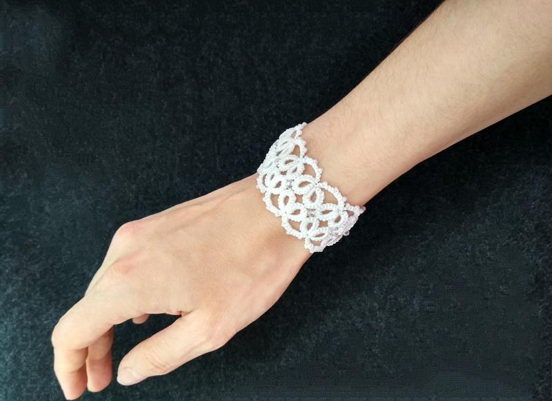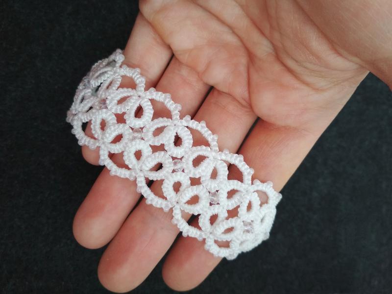Ручная работа. Данный праздничный браслет можно повторить в любом цвете к любому торжеству! Свадебный браслет изготовлен из кружева ручного плетения. Кружево выполнено в технике фриволите. Браслет для невесты изготовлен из шелковисто-нейлоновых нитей, белого бисера и кристальных бусин. Застёжка - магнитный замочек, очень крепкий (браслет не слетит с руки) и удобный (одеть и снять браслетик невеста может без сторонней помощи). По желанию застёжка может быть так же карабинчик с цепочкой либо тогл. Ширина браслета 3 см. Размер на заказ.