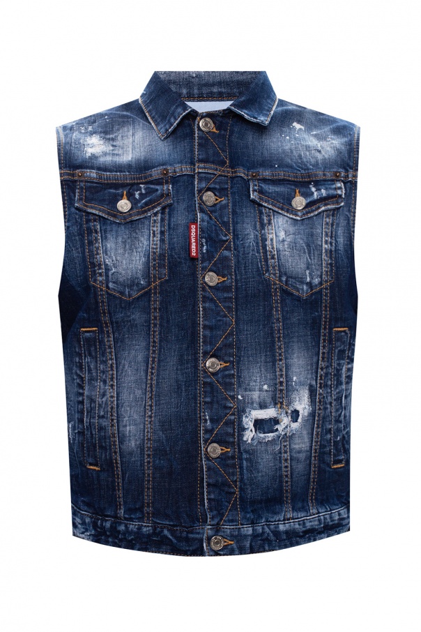 Navy and blue denim vest with a raw trim from Dsquared2. Fastened with buttons, this garment is complete with a buckled strap at the back, orange stitching details, two slip pockets and two buttoned flap pockets.