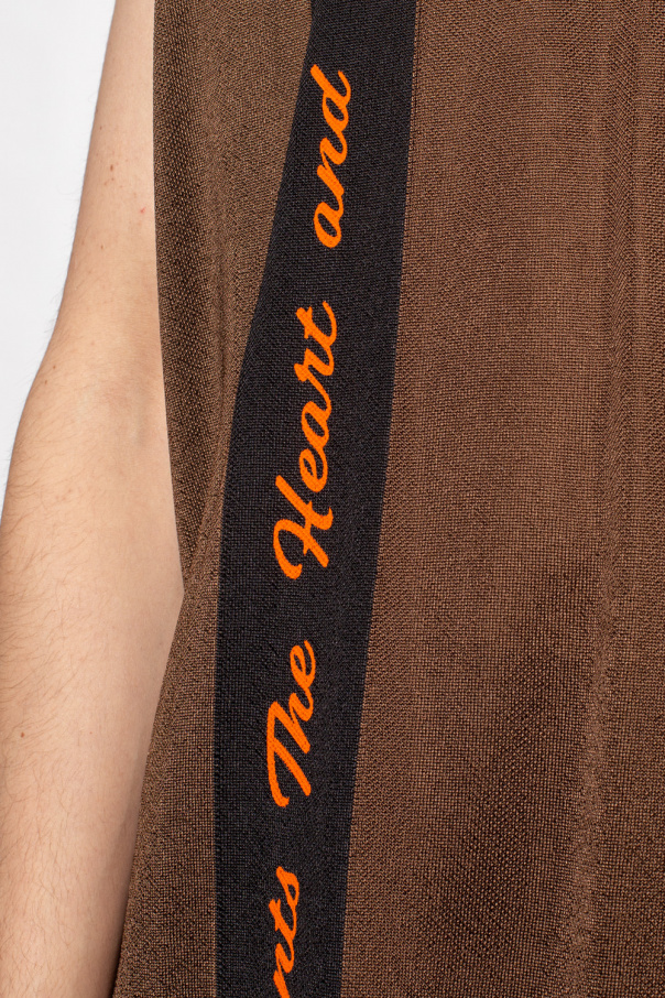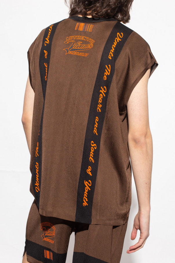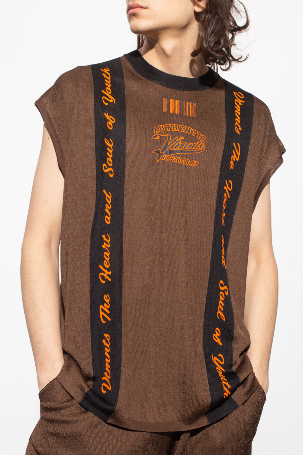 Brown and black sleeveless crewneck T-shirt from VTMNTS. Crafted from lustrous fabric, this style features an elasticated collar and graphic prints on the front and back including a ‘VTMNTS College’ theme and the brand\'s signature bar-code in orange.
