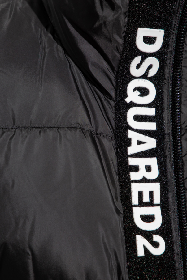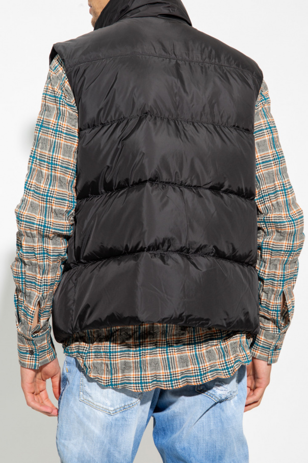 Black vest from Dsquared2. Filled with duck down, this style secures with a two-way zipper and velcro placket and features quilted details, two zip pockets and a drawcord-adjustable hem.