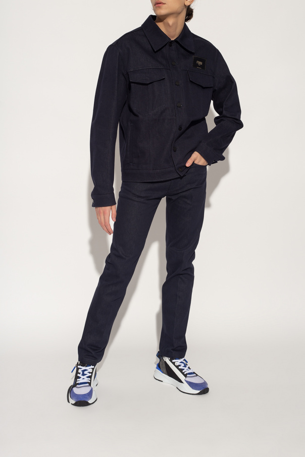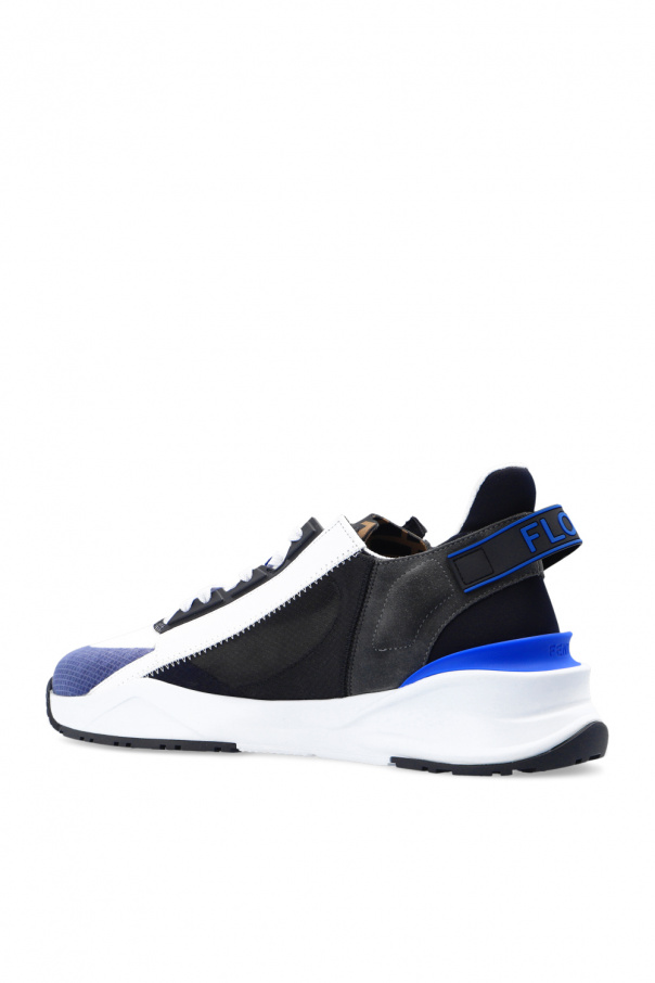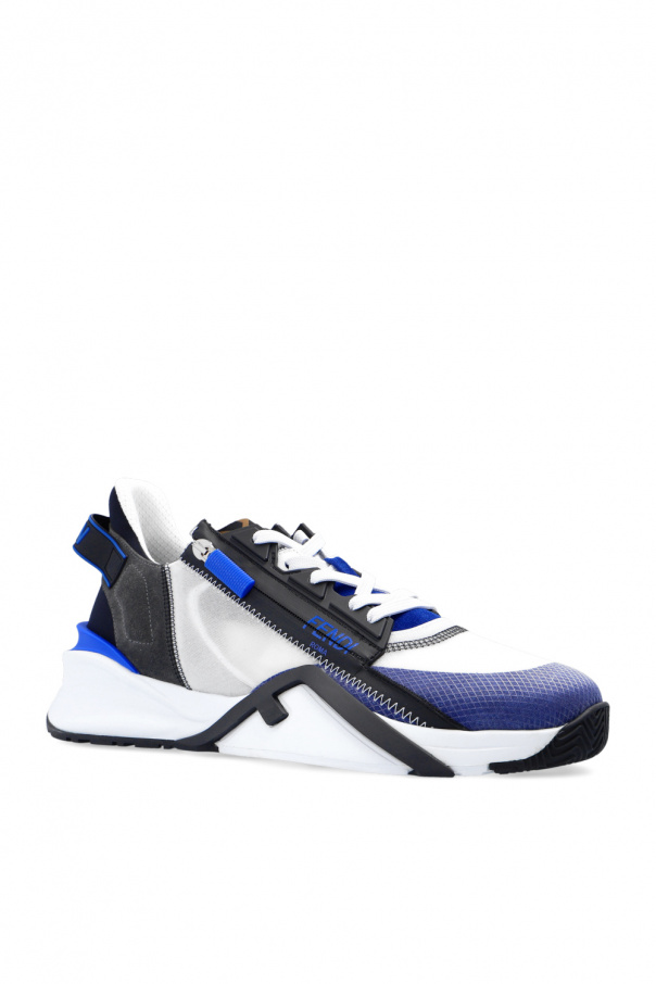 Blue, black and white ‘Fendi Flow’ sneakers from Fendi. Crafted from calf leather and fabric, this lace-up model sits on a white and black rubber sole and features a distinctive zip closure.