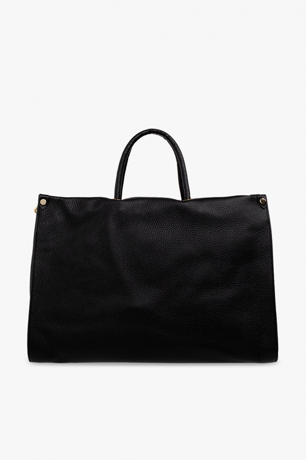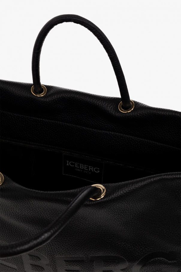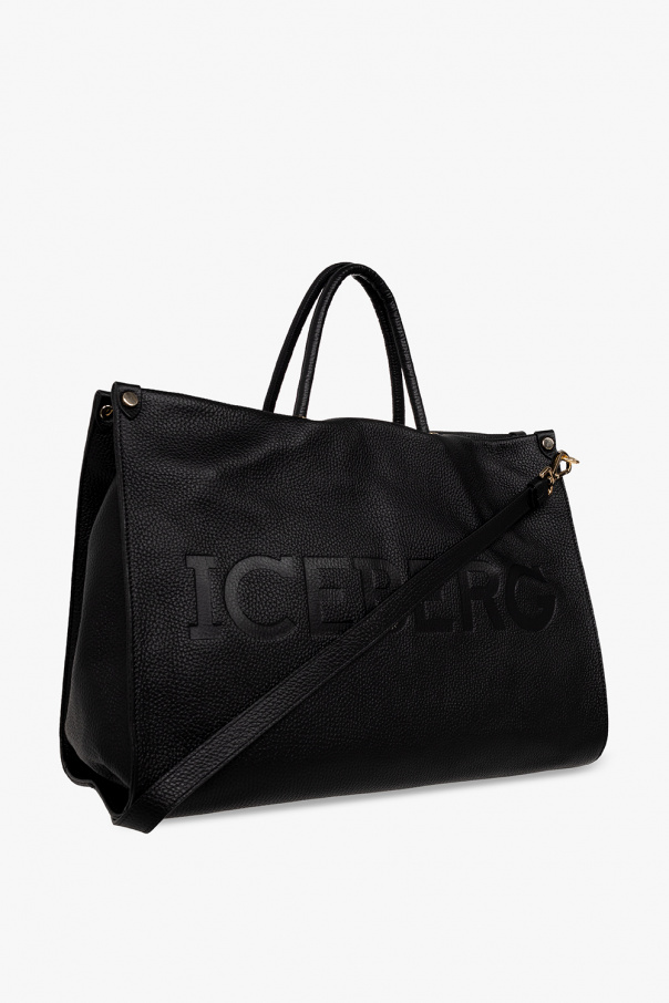 Black shopper bag from Iceberg. Crafted from calf leather, this design features a zip fastening, an embossed logo, a detachable and adjustable shoulder strap, two half-round handles, gold-tone metal hardware and one internal compartment with two slip pockets and one zip pocket.