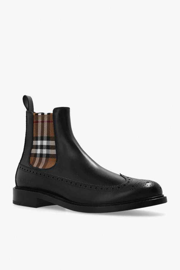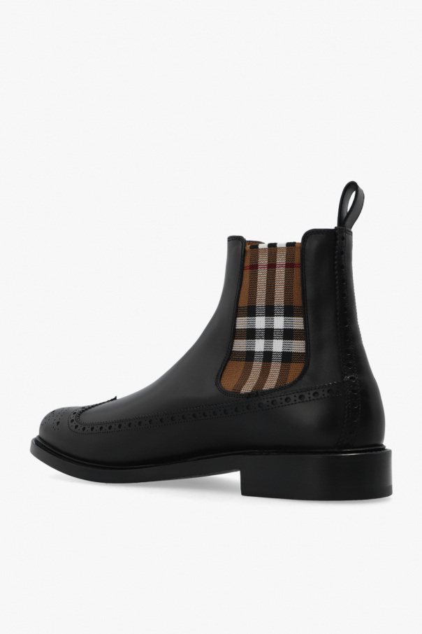 Black ‘Tanner’ Chelsea boots from Burberry. Crafted from leather, this model sits on a black leather sole and features decorative cutouts and elastic panels on the sides with the brand\'s signature ‘Nova Check’ pattern.