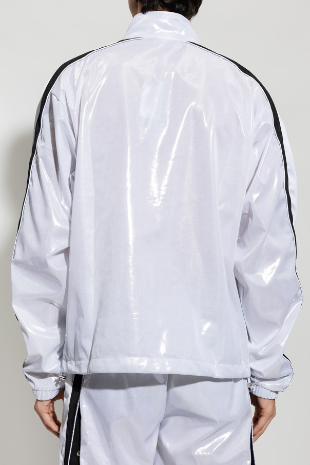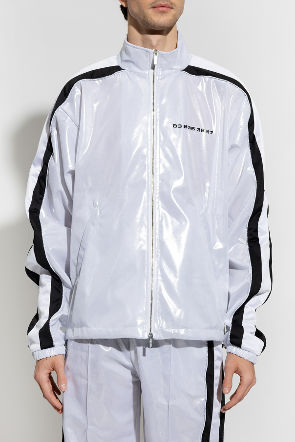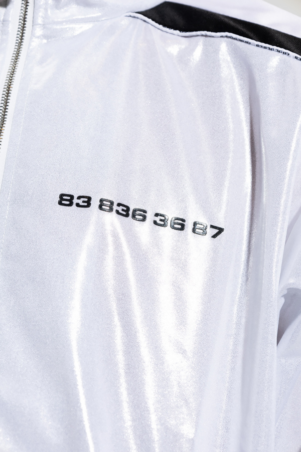 Silver-tone sweatshirt with a standing collar from VTMNTS. Emblazoned with a rubberised logo print, this style features a two-way zip fastening, black and white taping on the sleeves, two zip pockets, a drawcord-adjustable hem, a mesh lining and long sleeves with elasticated cuffs.