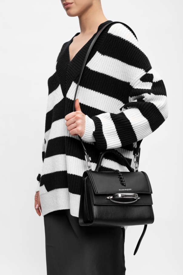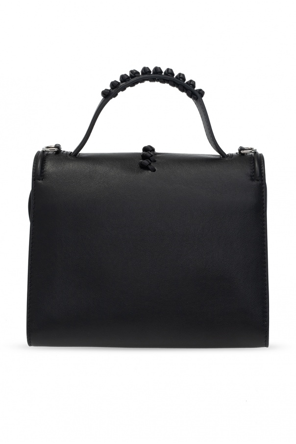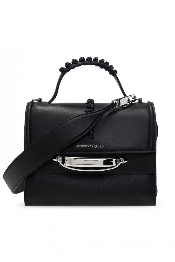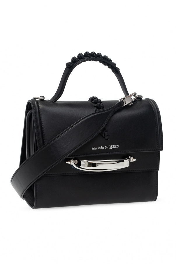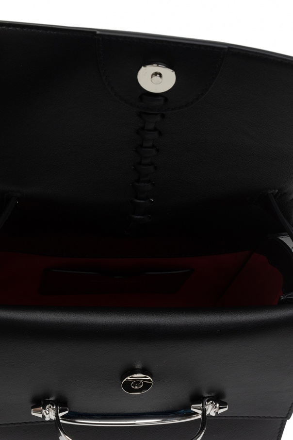 Black ‘The Story’ shoulder bag from Alexander McQueen. Crafted from calf leather, this design fastens with a magnetic snap and is enriched by silver-tone prints, woven details and a decorative handle. It is complete with a front zip pocket, half-round handle, detachable and adjustable shoulder strap and silver-tone metal hardware. The interior is lined with red suede and includes one compartment with one slip pocket.
