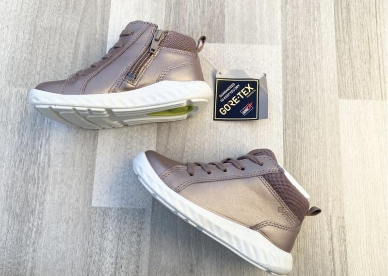 23довжина устілки від краю до краю 15 см шир. 5.9 см 24р довжина устілки 15.5 cm Завдяки мембрані ноги не промокнуть і завжди будуть в телпі і сухості. Модель зручна, взувати легко. Молнія сбоку добре фіксує ніжку дитині. • Лита конструкція підошви FLUIDFORM™ Natural повторює вигини стопи та забезпечує легкість ходи • Технологія GORE-TEX® гарантує водонепроникність та комфорт • Технологія ECCO SHOCK POINT забезпечує відмінну амортизацію • Повітропроникна текстильна підклад