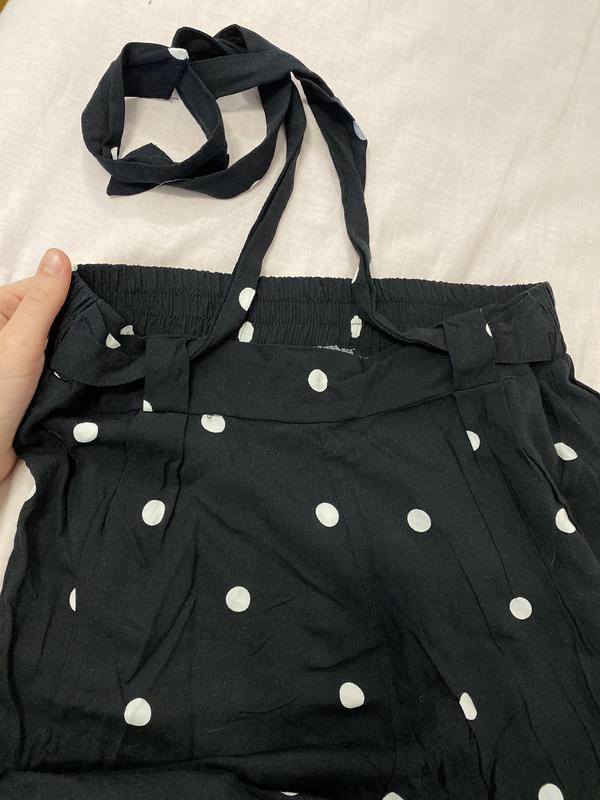 Полуобхват талии 33 см Полуобхват бедер 50 см Посадка 30 см Длина 100 см Сзади на резинке, спереди завязываются