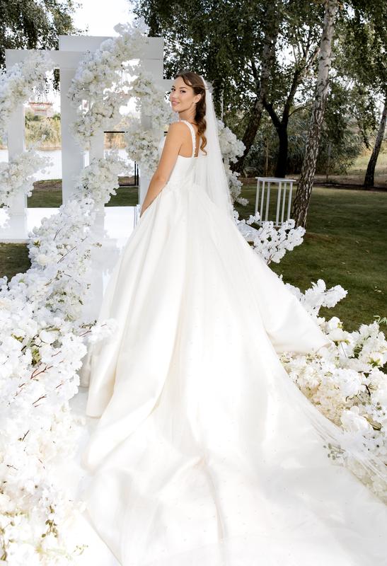 Роскошное свадебное платье, которое собрала кучу комплиментов Одетая 1 раз; Состояние идеальное; • Сделана профессиональная химчистка; • размер S, но есть корсет, так что параметры могут немного регулироваться; •Имеет красивый шлейф. •Из премиальной ткани Микадо; •Внутри корсет, который делает идеальную талию, внешняя скрытая молния. •Кольца в подарок