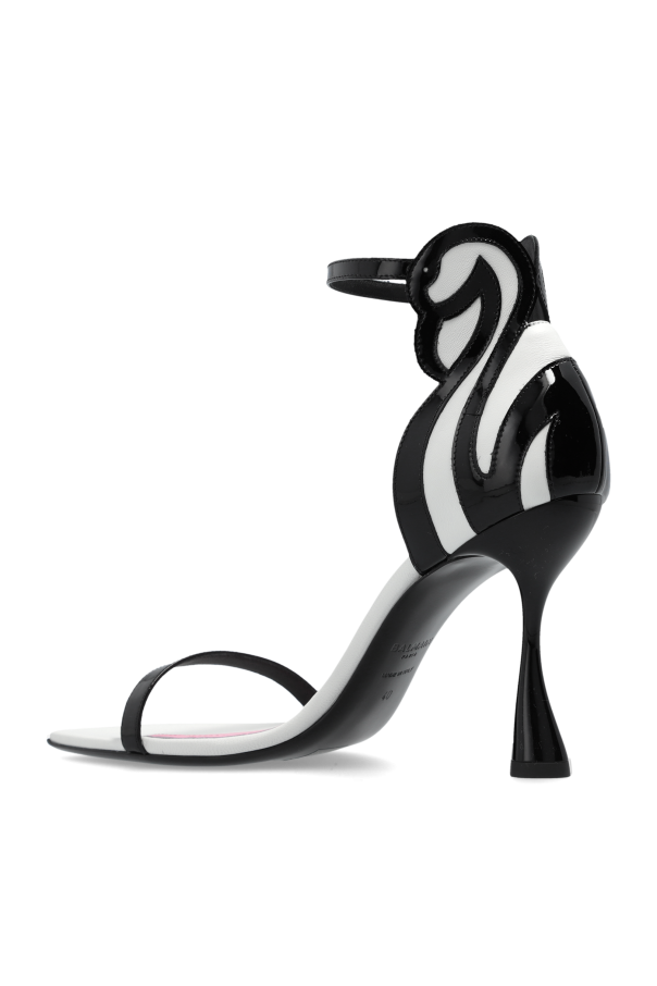 Introducing the exquisite Eden Heeled Sandals by the illustrious house of Balmain, these sandals epitomize the marriage of elegance and contemporary design. Featuring a modern silhouette with curved lines, these sandals are crafted from premium materials, offering both sheen and durability. The captivating geometric and wavy pattern on the heel imparts a distinct character, while the sleek black color, accented with white and pink, ensures versatility and sophistication. The sandals boast a high and slender heel with a subtle flare at the base for enhanced stability, making them perfect for special occasions. Attention to detail is evident in the inner pink insole adorned with a delicate pattern, providing a gentle contrast. The iconic \"BALMAIN PARIS\" logo graces the insole, reaffirming the sandals\' luxurious pedigree. The ankle strap, complete with a golden buckle, ensures a secure and adjustable fit. Why Choose These Sandals? Elegant and modern design for a distinguished look. High-quality materials for durability and a polished finish. Unique geometric and wavy heel pattern for added flair. Comfortable and stable high heel with a subtle flare. Adjustable ankle strap with a gold buckle for a perfect fit. Exclusive Balmain branding for a touch of luxury.
