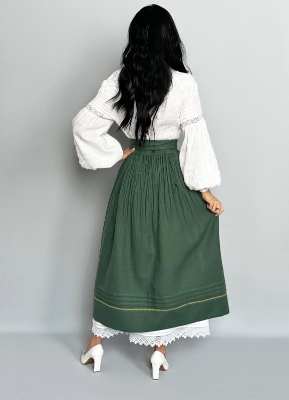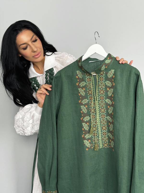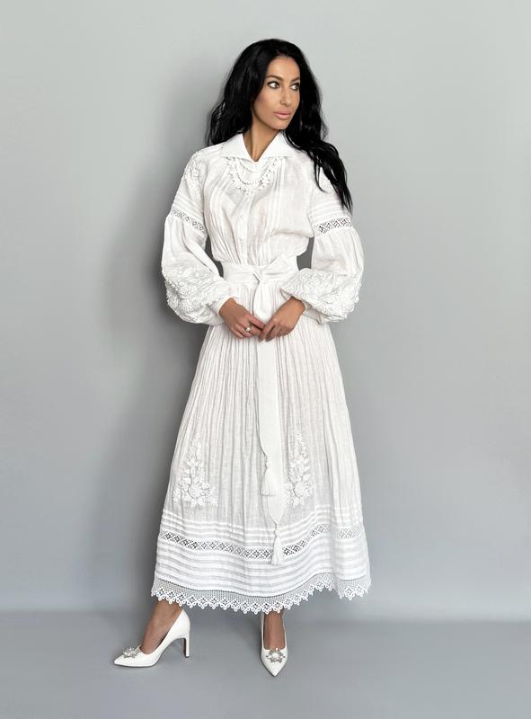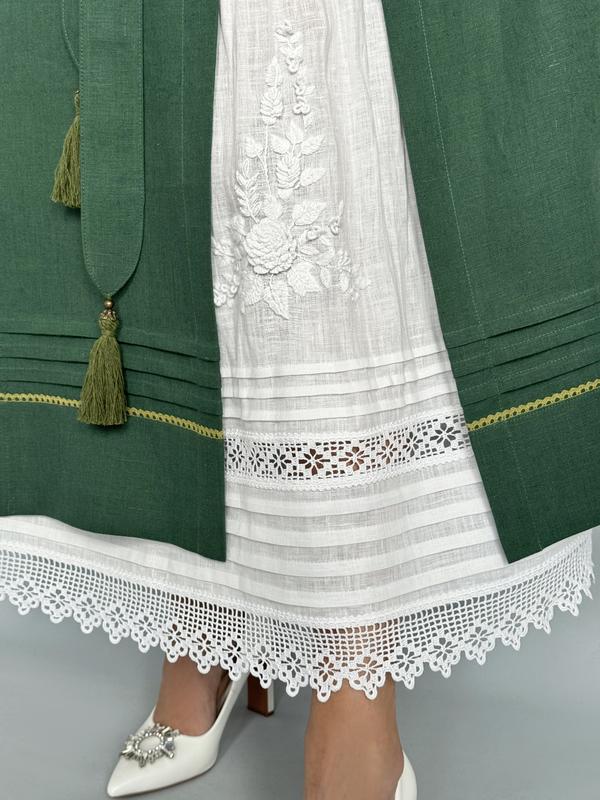 На замовлення у розмірі клієнта 1,5-2 місяці (в залежності від черги) Комплект з льону: вишита сукня і плахта з поясом. Сукня з білого льна 100% . Рукав реглан з уставкою, манжет на резинці. По переду комірець і застібка. Сукня прикрашена вузькими складочками і мереживом ручного плетіння гачком. По рукавам і спідниці виконана об’ємна ручна вишивка білим по білому за особистим авторським малюнком. Пояс в два оберти з китицями ручної роботи. Сукню можна носити окремо. Плахта малахітового кольору, 100% льон. Застібки по переду по поясу. По низу плахти складочки і тонке натуральне мереживо. Пояс в два оберти з китицями ручної роботи. До комплекту можна замовити текстильну прикрасу в етно-стилі з металевими елементами. Чоловіча сорочка замовляється окремо з узгодженням побажань клієнта. Аванс на замовлення від 30% Список мірок висилаємо, або можете завітати до нас в майстерню для зняття мірок (м. Вінниця).