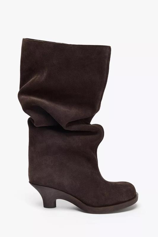 Чоботи на підборах «кітен» із замші. Широка халява. Легко взуваються. Закруглений носок. Висота підборів: 4 см КОРИЧНЕВИЙ | 3017/610/700