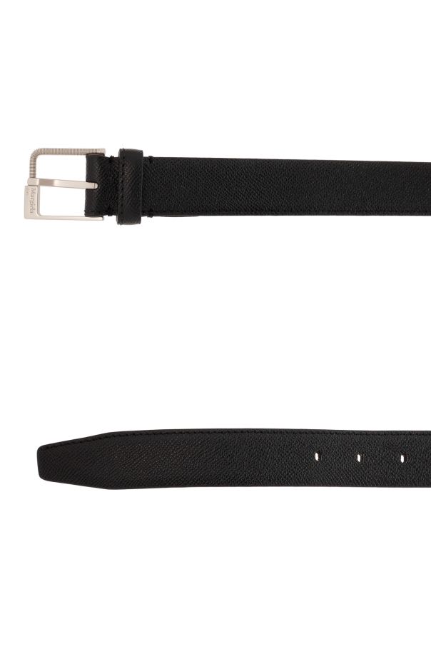 Black belt from Maison Margiela. Made of leather, this design features the brand’s signature white stitches and logo-engraved buckle in silver-tone metal.