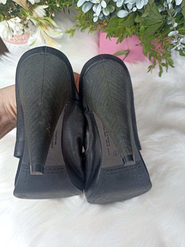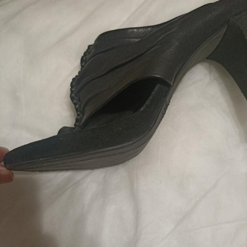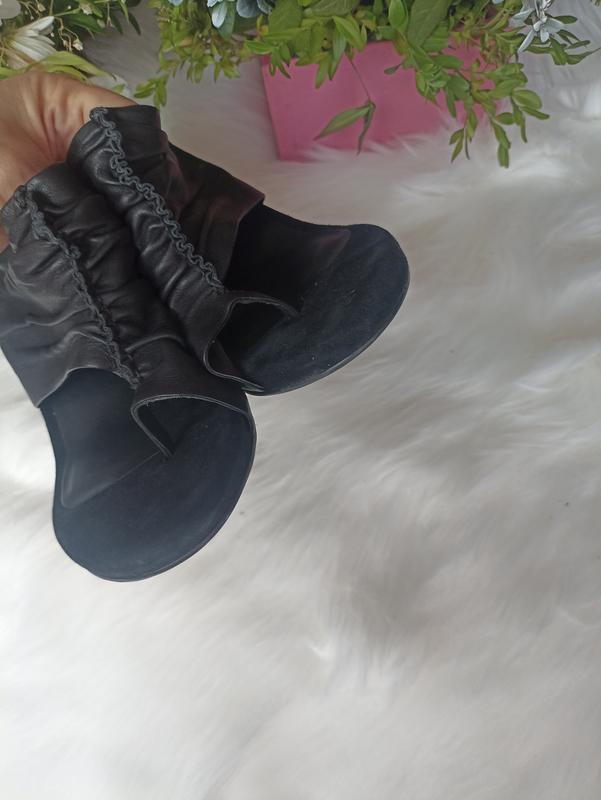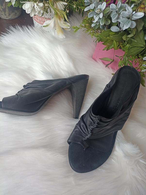 Фирменные кожаные шлепанцы 39р. Стельки 25см. На каблуке 11см. Форма шлепанцев хорошо держит ногу. Кожа мягкая.