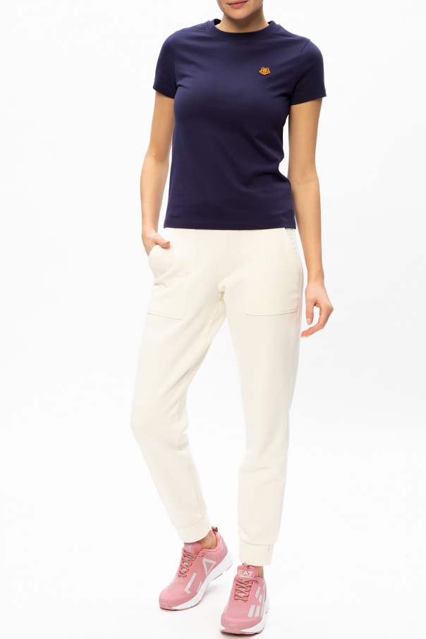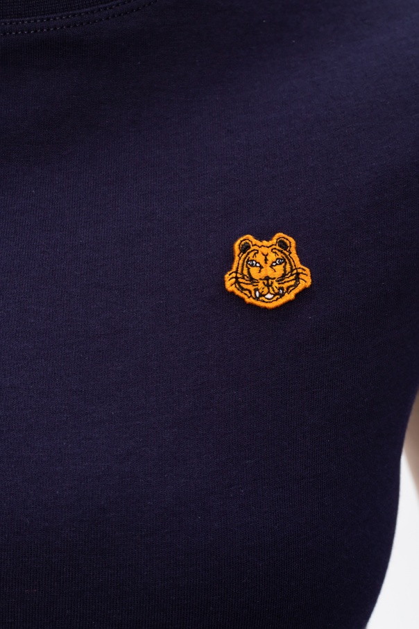 Navy blue crewneck T-shirt from Kenzo. Crafted from cotton, this style has an elasticated collar and an orange, white and navy blue logo patch for the brand recognition.