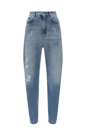 Blue ‘Medium Waist Jennifer’ jeans from Dsquared2. Made from distressed cotton with time-worn effects, this pair falls with tapered legs and features button fastenings, classic five-slip pockets and a logo patch on the back.