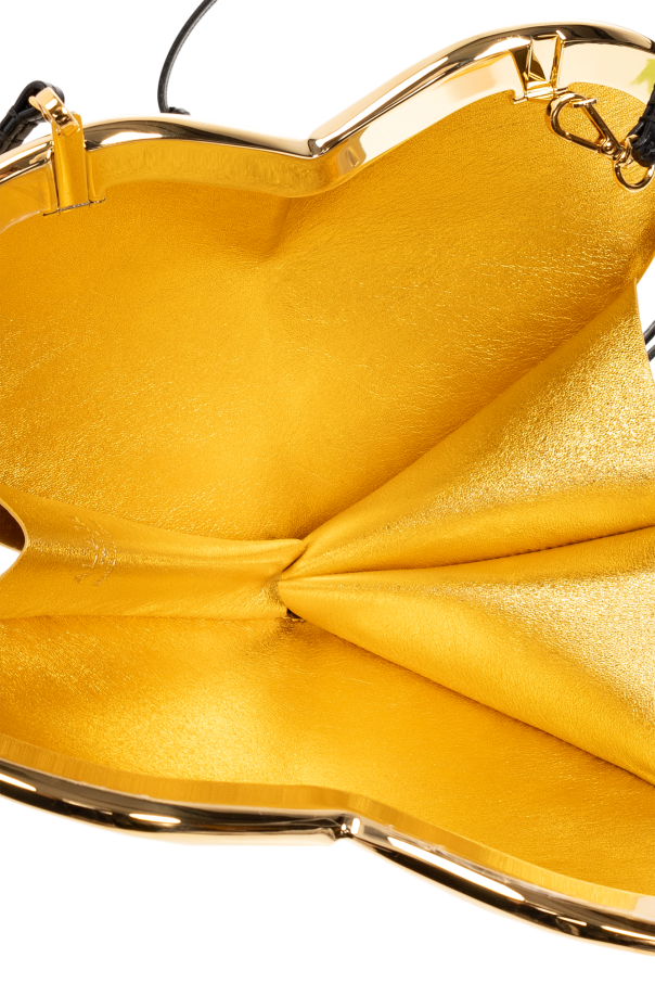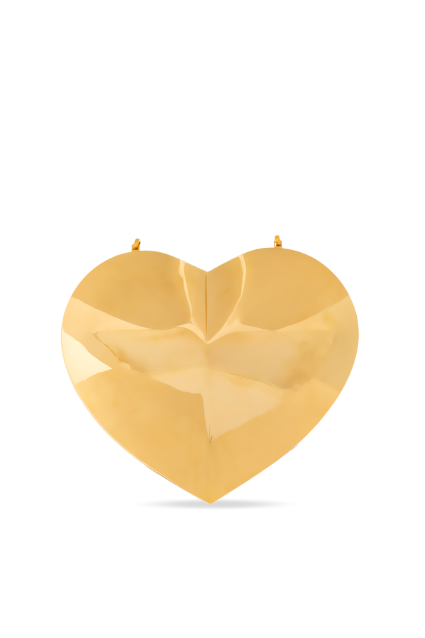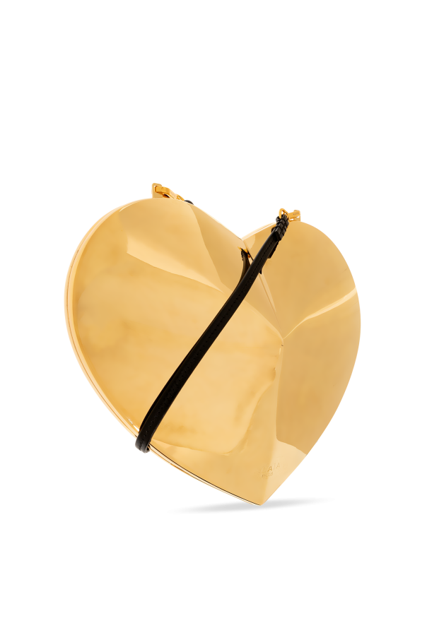 Gold-tone ‘Le Coeur’ shoulder bag from Alaia. Made of brass with a heart shape, this design secures with a magnetic fastener and features an adjustable shoulder strap in black calf leather.