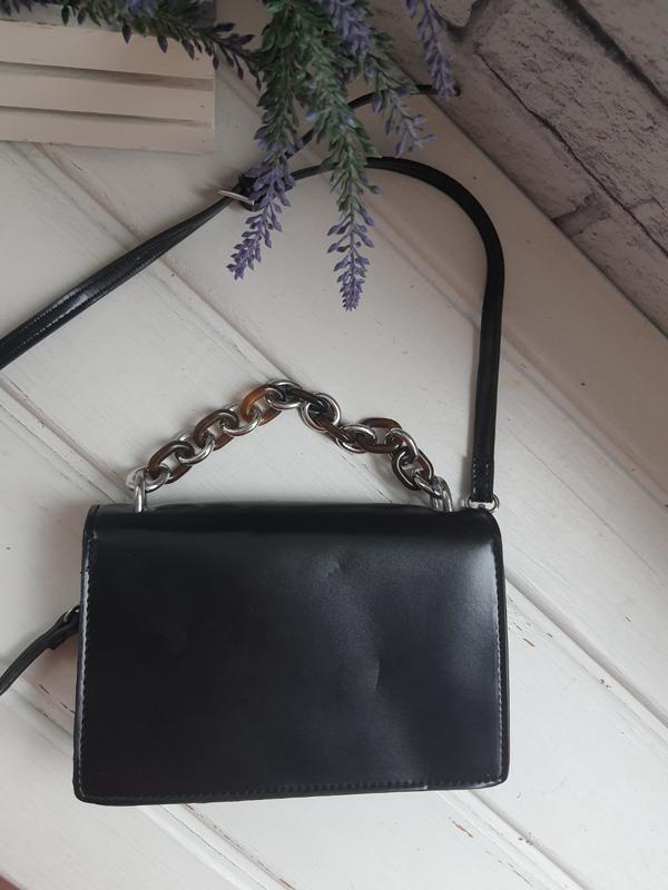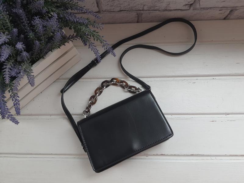 Маленька чорна сумка крос-боді,бірка фірми зрізана,залишився штрих-код.Розмір 20×13×6.5 Стан ідеальний,окрім царапин на фото(дитина іграшкою поцарапала),коли одягнена не видно.Дана модель сумки дуже гарно виглядає.