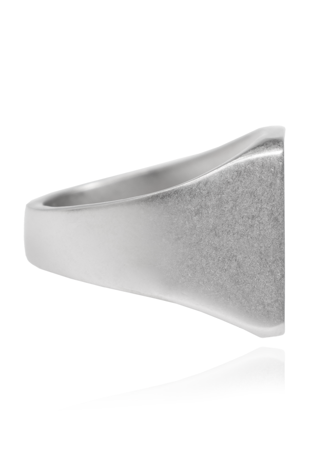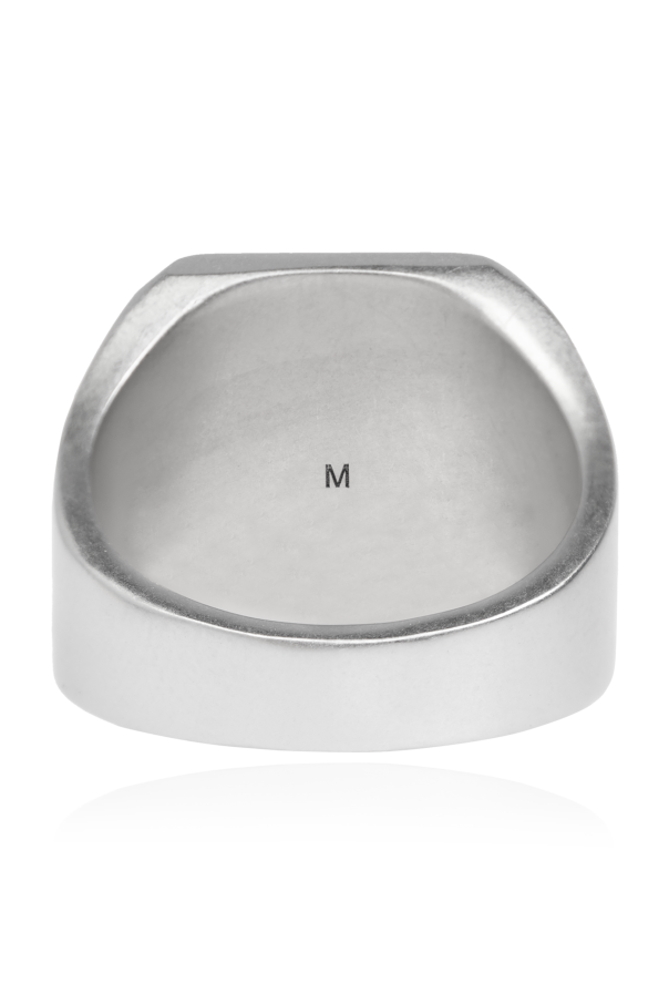 Introducing the VETEMENTS Logo Ring, an exquisite piece from our exclusive collection of accessories crafted by the renowned designer VETEMENTS. This ring showcases a bold, rectangular face with rounded edges, exuding a striking elegance and solid presence. The front of the ring features the intricately engraved \"VETEMENTS\" logo, which stands as the focal point, underlining its exclusivity. The silver-toned metal, finished with a matte surface, lends a modern and luxurious aura to this unisex accessory. Inside the ring, you\'ll find a discreetly engraved \"M\", indicating its size. This piece is designed to be a universally cherished addition, suitable for both men and women who appreciate contemporary and sophisticated jewelry. Why choose this product? Exclusive engraved \"VETEMENTS\" logo Modern matte silver finish Bold and elegant rectangular design Unisex appeal Crafted from premium brass