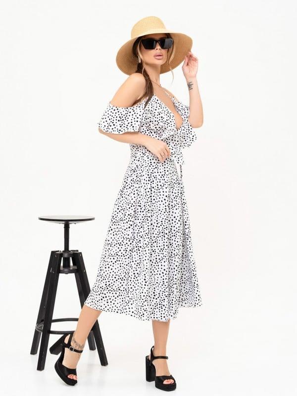 Белый горошек сарафан на тонких бретельках с воланами на плечах и декольте. Модель из софта с кроем платья-халата на запах и расклешенным низом миди длины. Модель приталена тонким поясом.