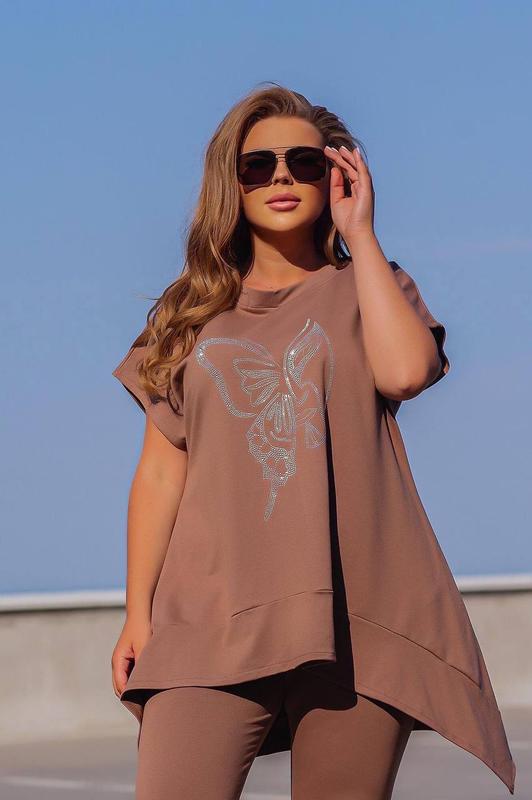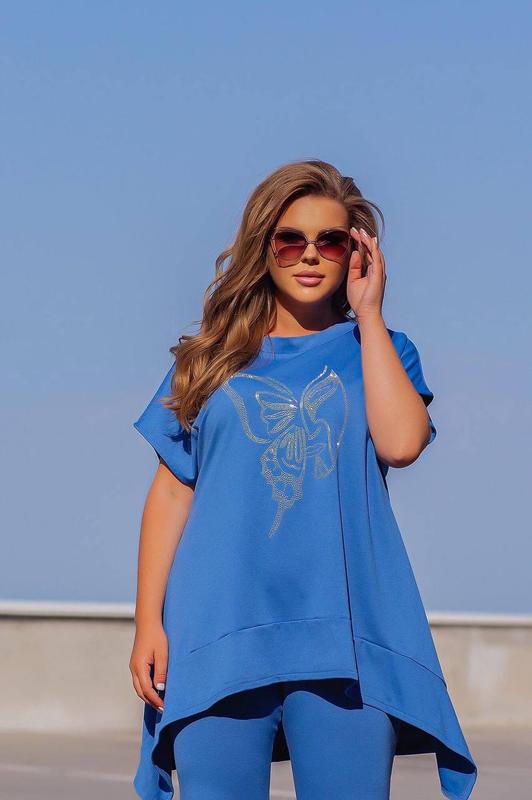 СЕВ/852 Костюм двійка (туніка+лосини) Тканина: двонитка. Розміри: 50-52,54-56,58-60,62-64. Колір: джинс, чорний, оливка та капучино. Туніка вільного крою, трапеція, в бічних швах кишені. Полиця туніки декорована малюнком зі страз. Бриджі висока посадка на гумці дуже зручні. Гарно тягнуться. Розмір: 50-52, 54-56, 58-60, 62-64. Туніка: ОГ-112см, 120см, 128см, 136см. Довжина плеча: 28см, 28см, 32см, 32см. Довжина виробу: 80см, 82см, 84см, 86см. Бриджі: ОС - 110см тягнетьс до 120 см, 116 см до 124 см, 122см до 132см, 130 см до 140см. Довжина бридж: 81см, 81см, 82см, 82см.