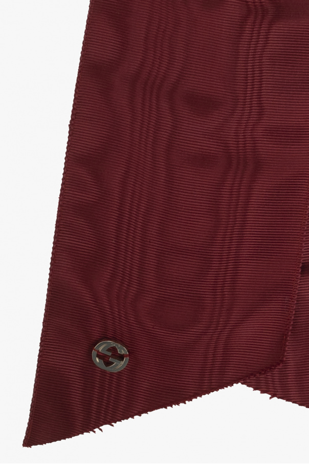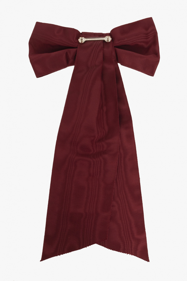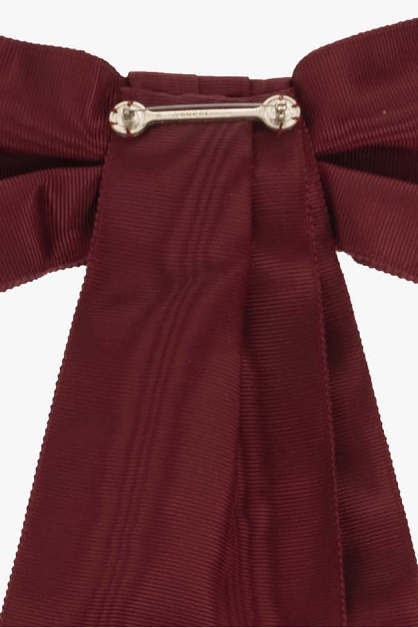 Burgundy bow-shaped brooch from Gucci. Fastened with a pin, this item is embellished with a stripe pattern, Interlocking G logo appliqué and light gold-tone brass hardware.
