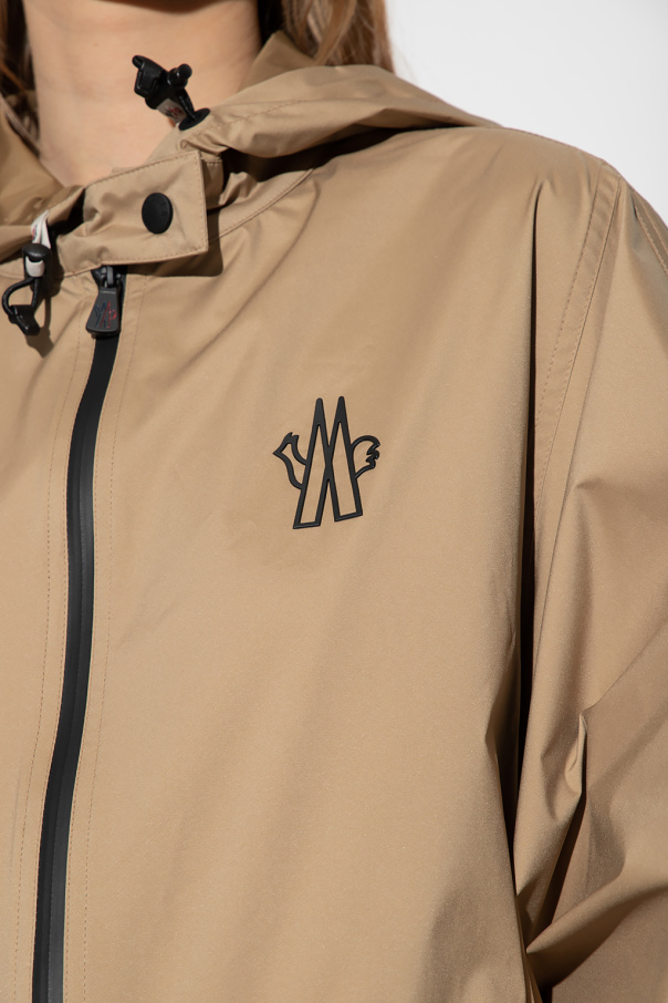 Beige ‘Vorassay’ cape from Moncler Grenoble, the ‘Moncler Grenoble Day-Namic’ collection. Fastened with a two-way zip, this design features drawstrings at the hood, waist and hem, printed and raised logo, two snap-fastened front pockets and cropped sleeves.