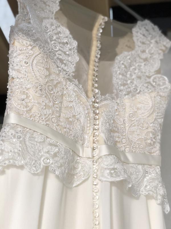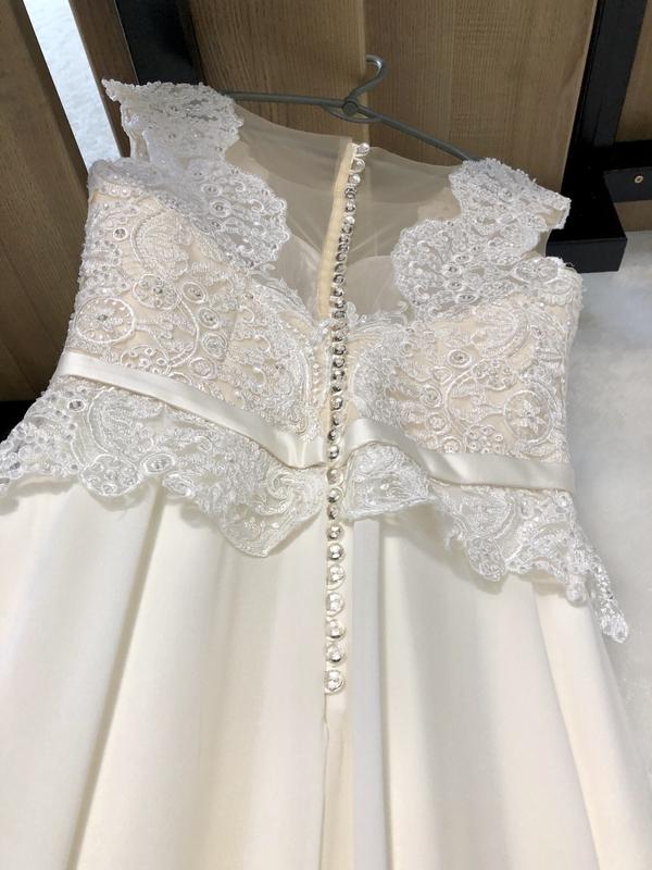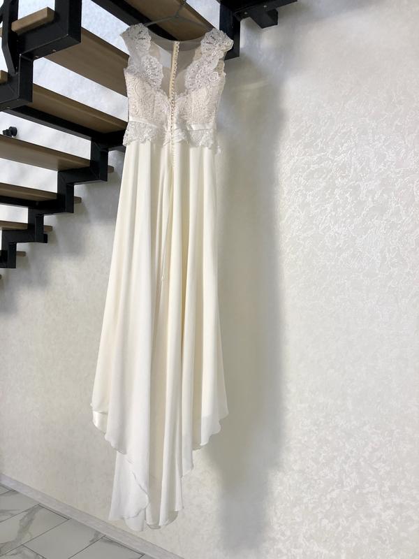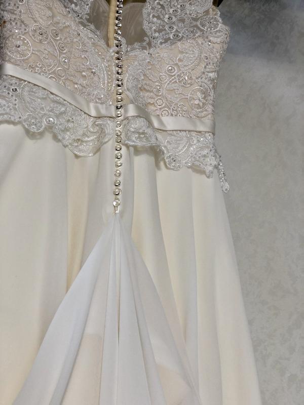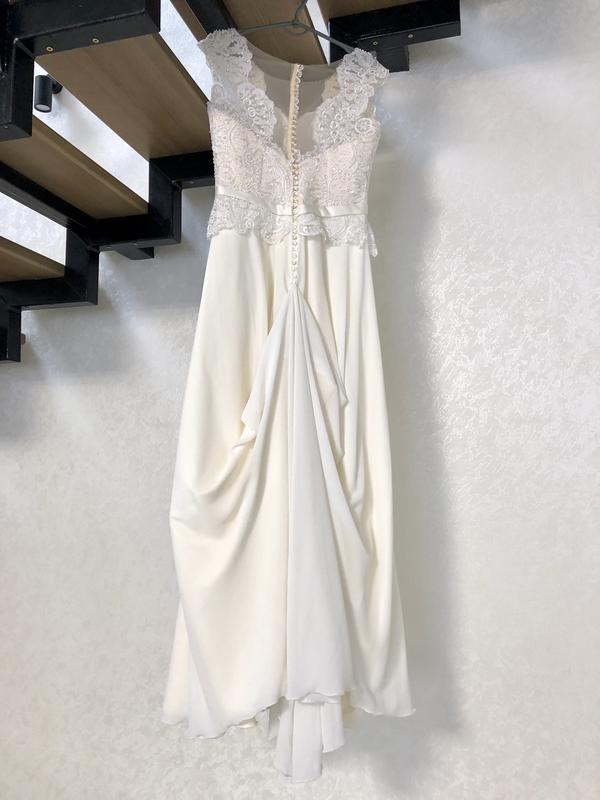 Свадебное платье, цвета Айвори, хороши сидит по фигуре, за счёт шнуровки сзади, можно регулировать утяжку, красивые пуговки, бисер, все ручная работа, сеточка на теле не заметна, шлейф можно одевать на пуговку, или по полу тянется. Платье после химчистки, как новое. В салоне что покупала, отдала на продажу, так они поставили за него больше чем оно стоило мне, я прошу половину цены, по которой покупала. На все дополнительные вопросы отвечу. Возможна примерка если по Днепру.