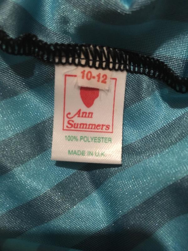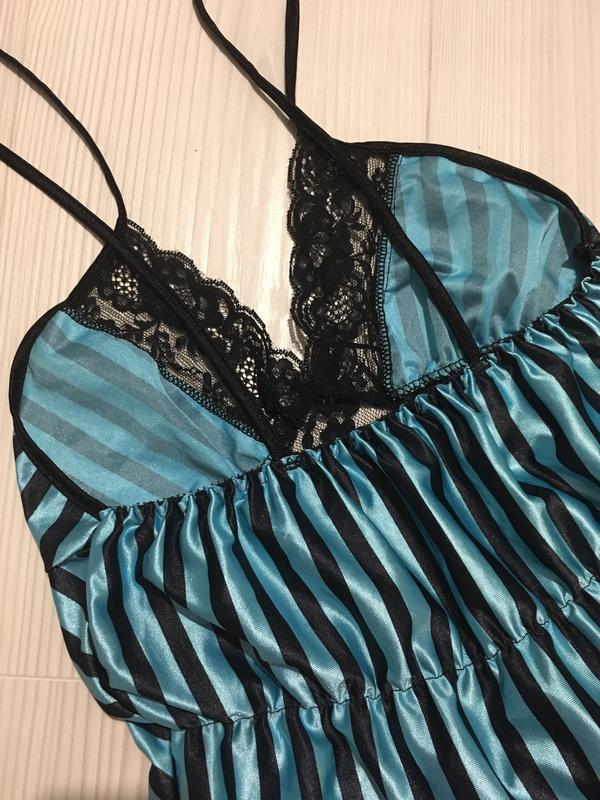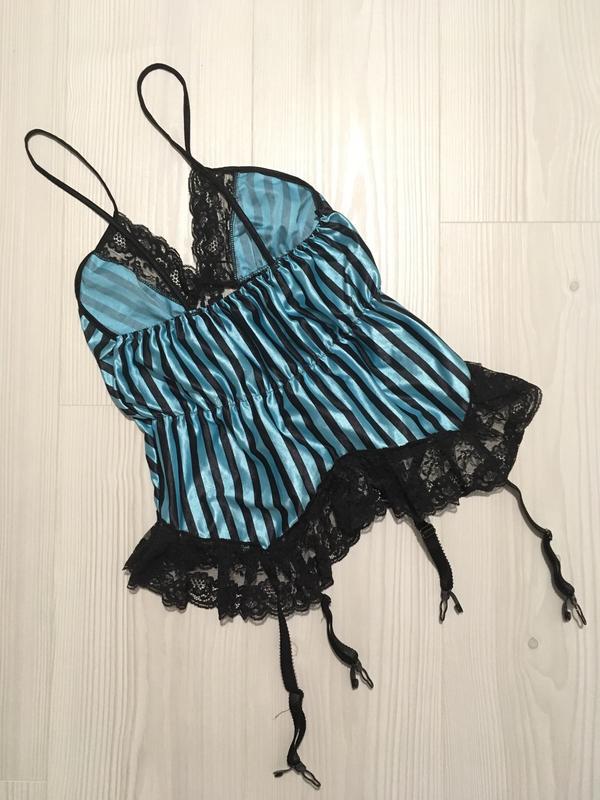 Дуже гарний пенюар з підтяжками для панчіх. Без підкладки. Спереду де чорне мереживо на животі і грудях - прозорий. Колір атласно блакитний, насичений, фото погано передає. Чашки м'які, підійде на повну А і В. Йде без застібки, одягається через голову, на спинці на резинці. Без дефектів. Виробництво Англія.
