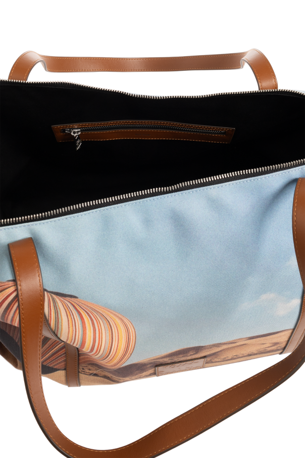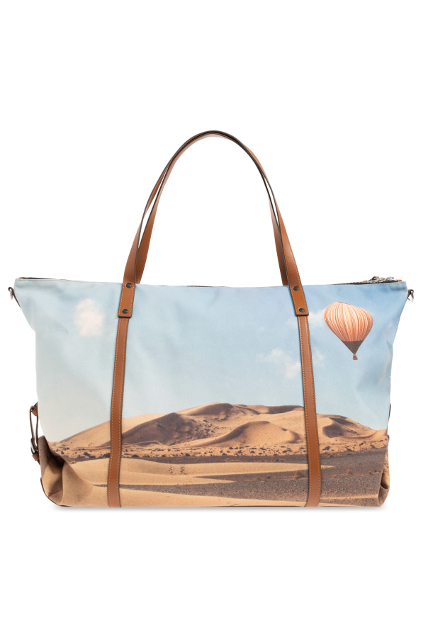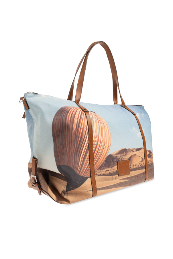 Multicoloured holdall from Paul Smith. Crafted from material decorated with a decorative print, this design fastens via a two-way zip and features a logo patch on the front, brown leather trims, silver-tone metal hardware as well as a detachable and adjustable strap, two handles and one internal compartment with one zip pocket and one slip pocket.