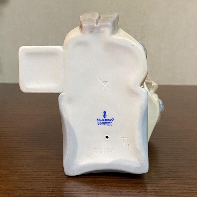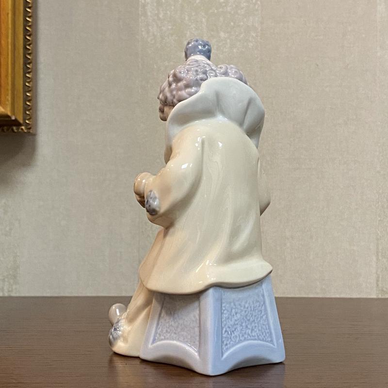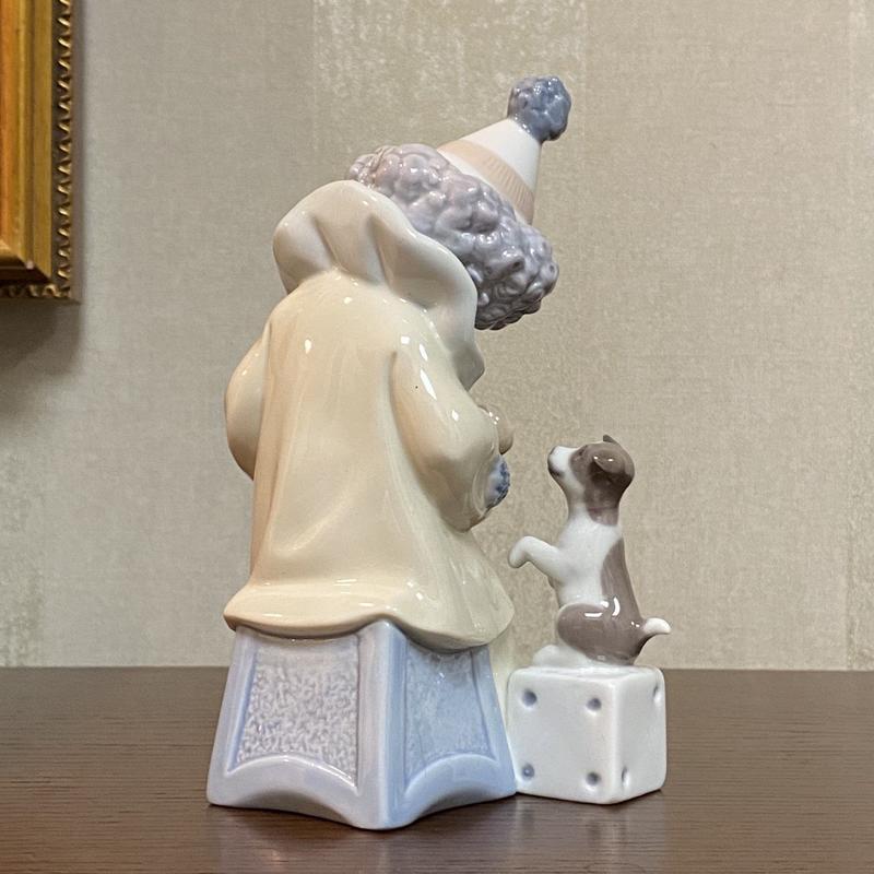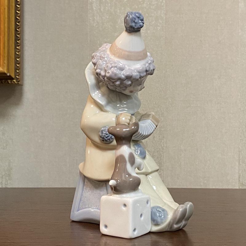 Фарфоровая статуэтка Lladro, № 5279, оригинальное название «Pierrot Clown With Puppy & Concertina (Клоун Пьеро с щенком и гармонью)». Глянцевый фарфор. Номер модели 01005279. Клеймо Lladro. Сделана в Испании в 1985-2007 гг. Ручная работа. Скульптор: José Puche. Фигурка изображает сидящего на стуле с вытянутыми ногами Пьерро в мешковатом клоунском костюме и колпаке с помпоном на голове, держащего в руках концертину. Маленький щенок стоит на задних лапках на цирковом кубе. Длина – 8,5 см. Высота – 15 см. Ширина – 7 см. Состояние: идеальное. Трещин, сколов, повреждений нет. Не в оригинальной коробке.