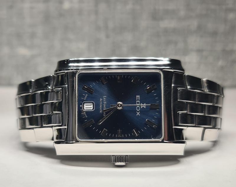 Чоловічий годинник Edox Les Fontaines 82002 Automatic Eta 2004-1 Стан відмінний (потертості та подряпини) Комплект: годинник Розмір годинника без заводної голови та увшок: 29.25х31 мм Размір годинника з заводною головою та вушками : 32.32х40.65 мм Товщина годинника 9 мм Кріплення під браслет 21 мм Браслет на руку з урахуванням годинника приблизно 18-18.5 см
