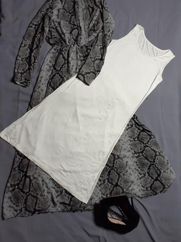оригинальное платье в змеиный принт, очень лёгкое воздушное, платье состоит из двух частей, верх принтованый и нижнее платье молочного цвета, длина 135, плечи 33, рукава 56, застегивается на пуховик, пот на резинке 37, пог 48, нижнее платье- майка длина 107, пог 43,