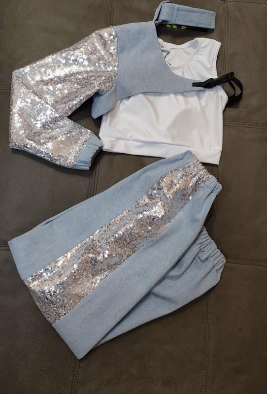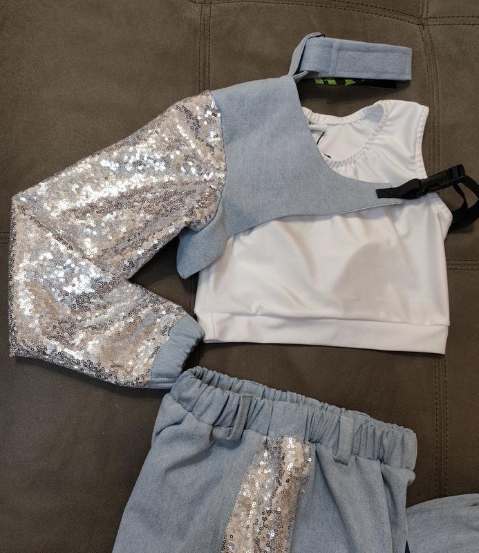 Детский танцевальный костюм hip-hop джаз-фанк, денсхол, хип-хоп, jazz размер 134 состав: джинс, пайетки штани: длина брюк 82 см ширина по поясу (резинка) 28 см растягивается до 42 см ширина по стегнах 51см топ белый ( бифлекс) длина топа 29см ширина топа 32 см длина рукава 50 см (с манжетом) рукав вместе с плечом 60 см Размер 140 Штани: Длина брюк 87 см Ширина по поясу 31 см (Разтягивается до 44 см) Ширина по стегнам 54 см Топ с рукавом: Длина рукава 52 см (с манжетом) Длина рукава с плечом 60 см Поставляем новой почте