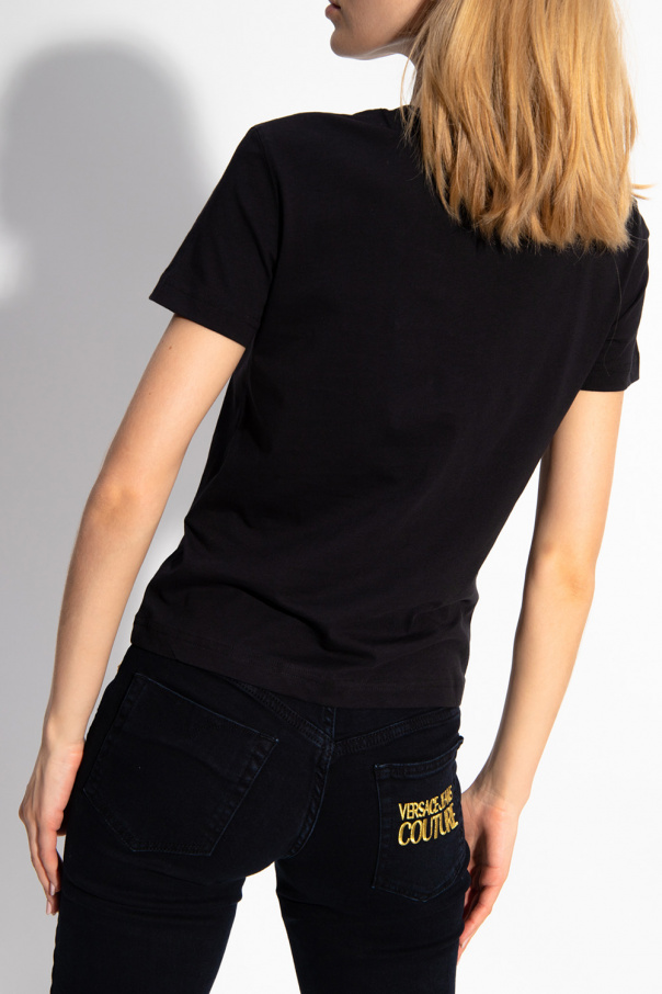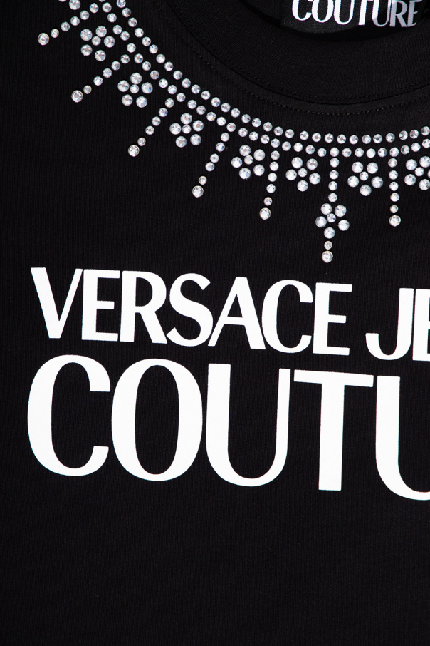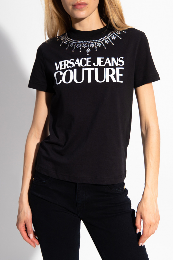 Black crewneck T-shirt from Versace Jeans Couture. Crafted from cotton, this style showcases glass stones and a white graphic print with the brand\'s logo on the front.