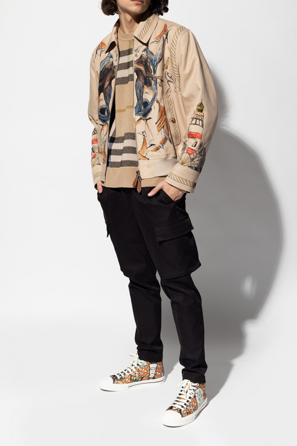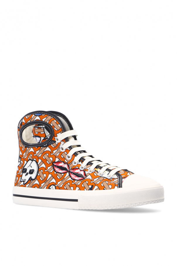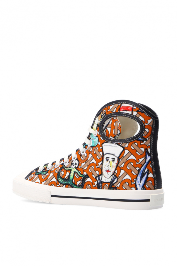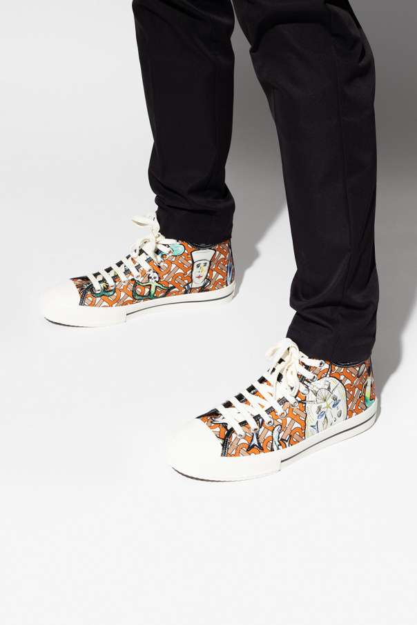 White, beige and black sneakers from Burberry. Embellished with a colourful graphic print with the brand\'s logo, this lace-up pair sits on a brown and white rubber sole and features leather trims, side cut-outs and a logo appliqué on the front.