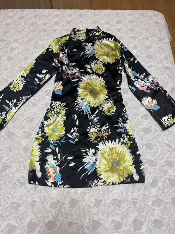 Нарядна яскрава сукня . Має довгий легкий та об'ємний рукав. Приталений силует. Фіксується блискавкою на спинці. Довжина 85 см, в груді 45 см, талія 37см,
