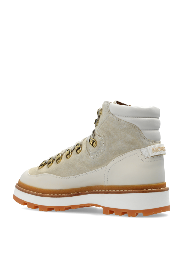 Introducing the \'Peka Trek\' trekking boots by Moncler, epitomizing the perfect synergy of elegance and functionality. These exquisite boots, presented in a refined cream hue, are crafted from premium leather and suede, ensuring durability and aesthetic appeal. The classic design features a high-top silhouette extending beyond the ankle, fortified with a robust sole equipped with a distinctive tread pattern. This guarantees superb traction, making them ideal for navigating uneven terrains. Adorned with golden metal hooks and eyelets for the laces, the boots exude sophistication. A padded collar around the ankle enhances comfort, while the designer\'s logo embossed on the heel accentuates their exclusivity. The sole, in a tasteful light brown with a white stripe, adds a stylish touch. These lace-up boots incorporate a Vibram rubber sole system, renowned for its exceptional grip and durability, ensuring a secure and comfortable fit for every adventure. Why Choose This Product? Elegant cream color with a stylish design High-quality leather and suede materials Golden metal hooks and eyelets for a touch of luxury Padded collar for optimal comfort Embossed designer logo for exclusivity Vibram rubber sole for unparalleled grip and durability