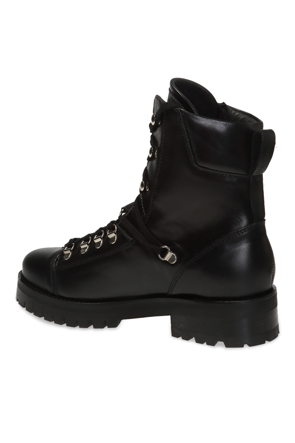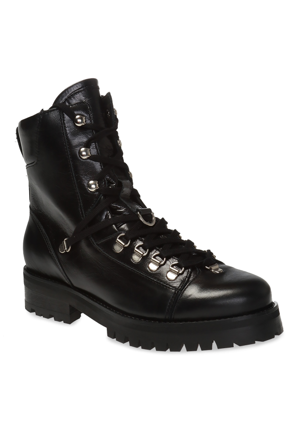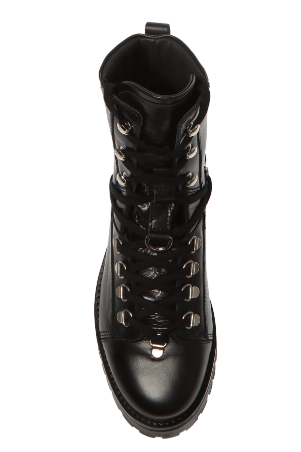 Black ‘Franka’ ankle boots from AllSaints. Made of leather. Embellished with an embossed logo. They rest on a black rubber sole.