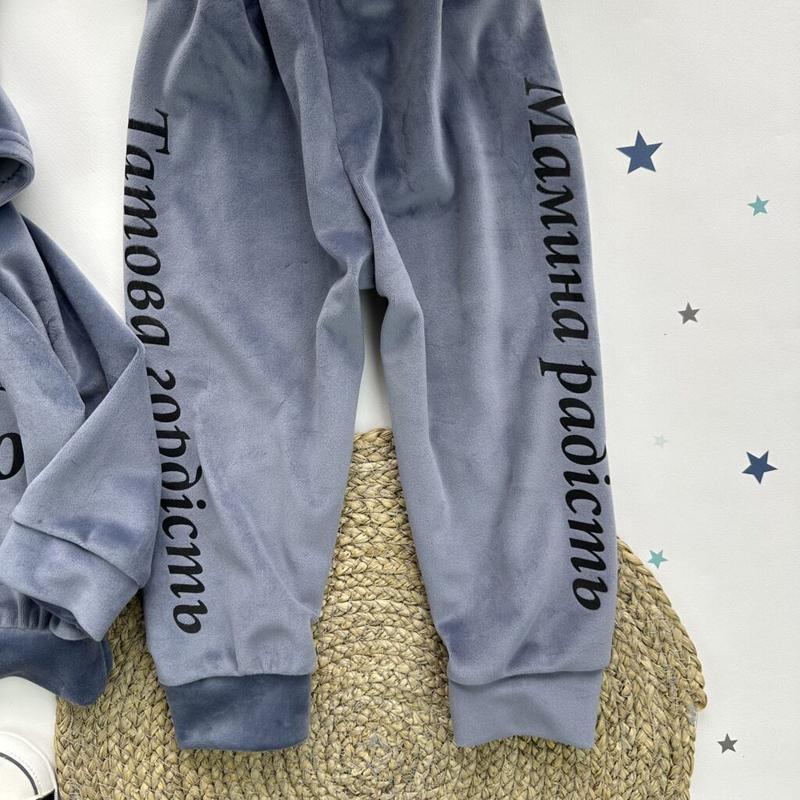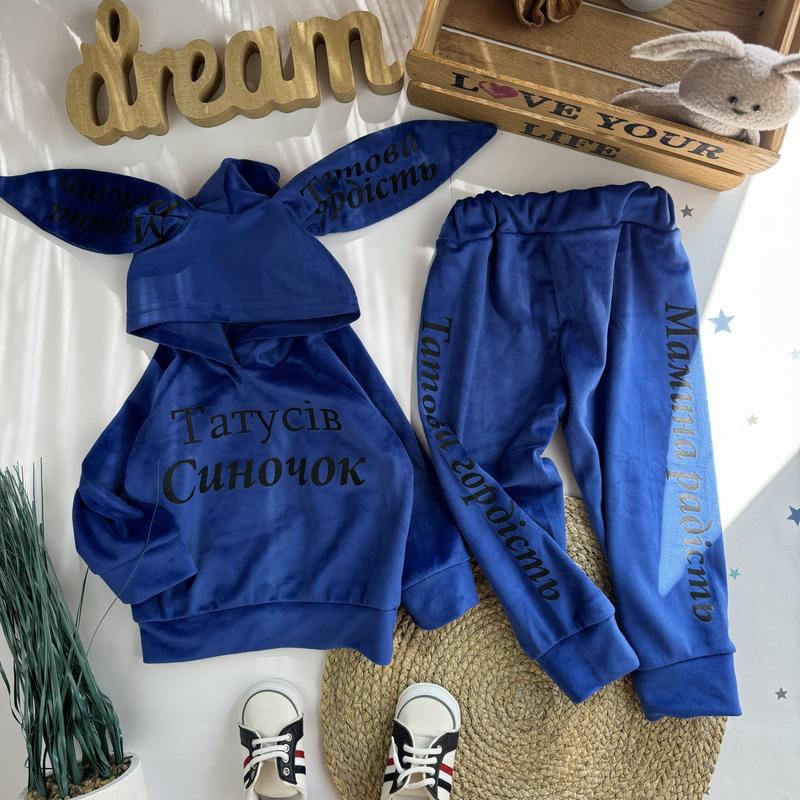 Отличный костюм с ушками! Велюр высокого качества! Худи с капюшоном. Производитель-Украина! Малюнок- накат. Рисунок- спереди, на ушках и и штанишках. Брюки – свободные, не широкие, с хорошей посадкой, на манжетах. Размеры: 48 (74-80)- худи рукав от капюшона 29, длина 30, брюки длина 46, шаг 29 52 (86-92)- худи 33/35, штаны 46/29 Цена: 450 грн
