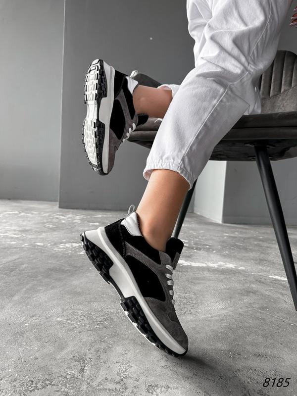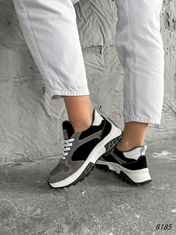 НОВИНКА Кроссовки женские Riko серые + черные + белая натуральная замша Код: 8185 Материал: натуральная замша + натуральная кожа Цвет: серый + черный + белый Подошва: 4 см, спереди: 3 см Внутри текстиль. Стелька мемори размер: 36-40 36-23,5 см 37-24 см 38-24,5 см 39-25,5 см 40-26 см Отшив любого размера 10-14 рабочих дней