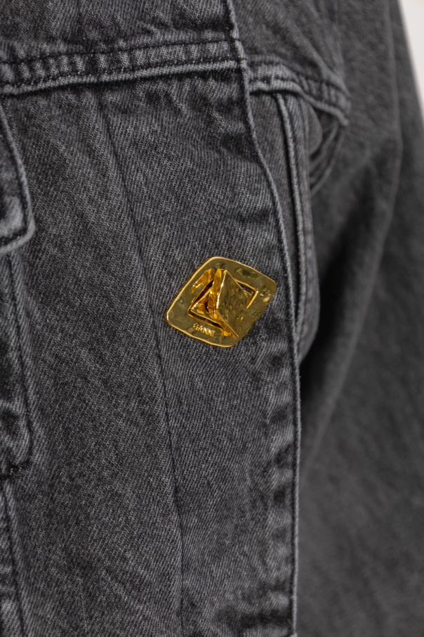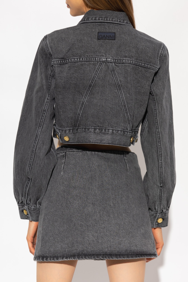 Dark grey denim jacket from Ganni. Cut with a cropped fit, this style secures with gold-tone twist closures and features a back logo patch, a flapped pocket with a snap on the front and puff long sleeves with button cuffs.