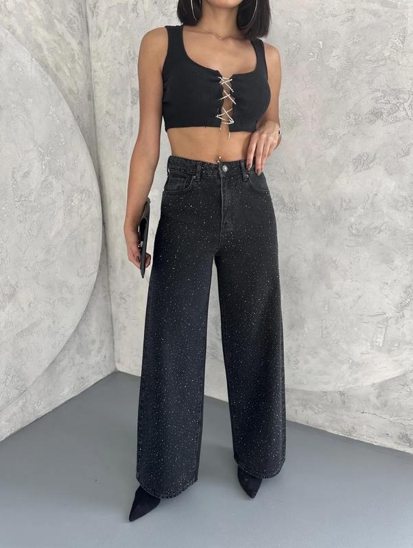 ЗАМІРИ розміру 42: ПОТ 41 см, ПОБ 55 см висота посадки 35см внутрішній шов 83 см довжина 116 см ширина штаніни 32 см Джинси, які не залишать тебе без уваги✨ Оригінальна модель палаццо, повністю в камінцях, просто неймовірно переливаються! Колір темно-графітовий, майже чорний, висока посадка, яка підкреслює талію, модель, що візуально витягує силует. Джинс не тягнеться, не стрейчевий, 100% котон, не дуже плотний, приємний, не жорсткий денім. Підійдуть на високий зріст! Виробник: Туреччина, Zeo basic Розміри: 42 Склад: 100% бавовна Пишіть, запитуйте, що цікавить, надам всі необхідні заміри та додаткову інформацію! ОПЛАТА: - повна оплата на рахунок ФОП - передплата 150 грн на рахунок, решта накладним платежем - безпечна оплата від Shafa ВІДПРАВКА відбувається в день замовлення, якщо оформлено до 13.00. Відправляємо кожного дня, крім понеділка