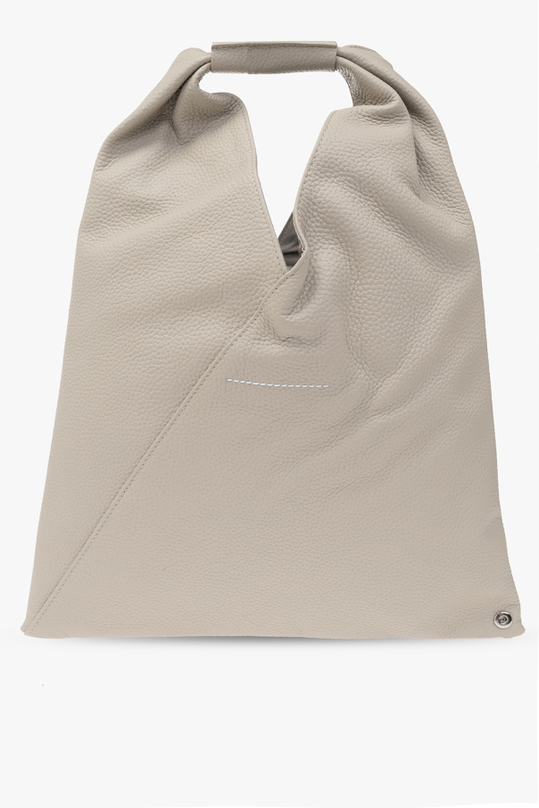 Grey ‘Japanese’ handbag from MM6 Maison Margiela. Made of leather, this model fastens with a snap closure and is complete with snap buttons for adjusting the shape, white logo embroidery on the front, short leather handle, silver-tone metal hardware and one internal compartment with one snap-fastened pocket.